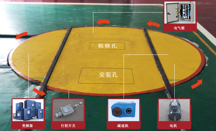 轉盤平臺一般為鋼制,選用優質鋼材焊接組成。平臺的直徑、高度、結構等根據制造標準要求及用戶需要特別設計,軌道裝在平臺上,通過行走裝置在地軌上實現正反向旋轉。為方便吊裝,在平臺兩側設置了起吊孔。